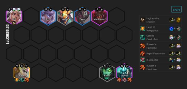 阵容推荐:剑魔、卡莉斯塔、亚索、锐雯、铁男、芮尔、德莱文、天使