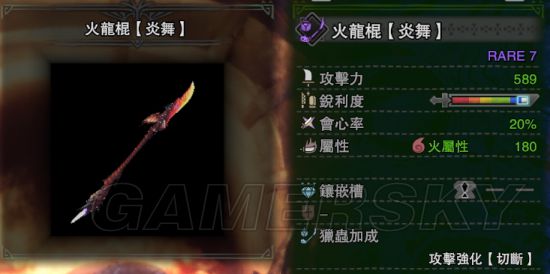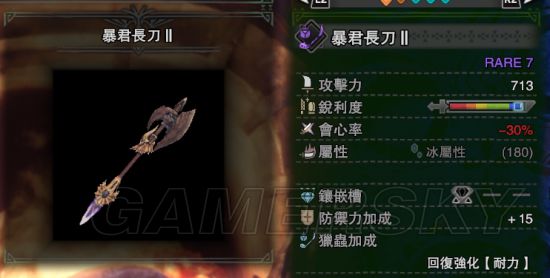 还是一样的对新人友好的武器(灭尽龙的武器大都有这种特点),可以一直用到游戏中期,后期想要追求更高输出的话,比较容易遇到瓶颈,喜欢就配吧~