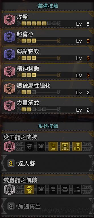 另外,诸如以下武器,泛用性并不算很高,所以就不说了,不过如果真的要用,也可以套用达人艺尸套棍的配法,在保证达人艺的情况下,另外两件防具以及护石任意搭配,只要能保证高会心配合达人艺即可。
