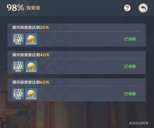 根据旅行者对各城区域的探索度,可获得声望经验与摩拉奖励。当探索度达到60%可获得所有奖励,共计可获得300对应城市声望经验与6万摩拉的奖励。此奖励为一次性奖励。