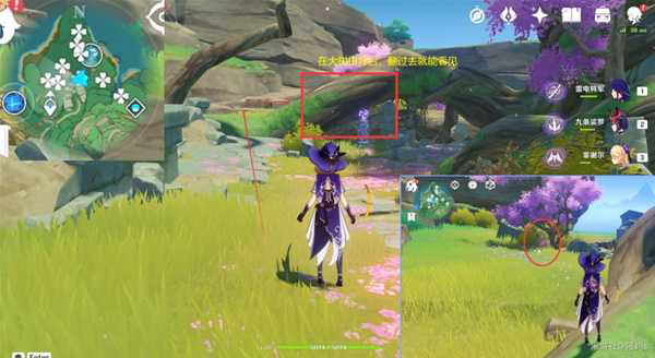 (1)路线流程 首先来到鸣神大社上方的秘境,朝着地图的西方向靠着山体走,在小树的背后就有一朵绯樱绣球。