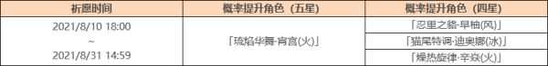 四星角色「忍里之貉.早柚(风)」「猫尾特调.迪奥娜(冰)」「燥热旋律.辛焱(火)」的祈愿获取概率将大幅提升!