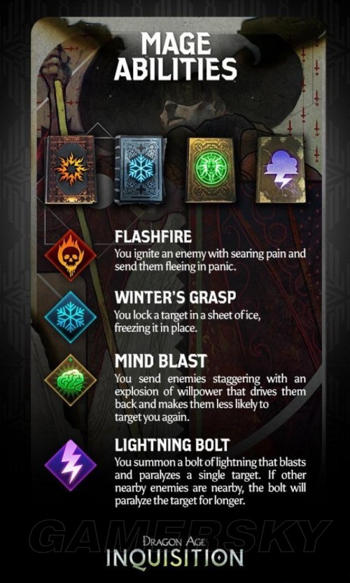 法师属于该游戏中的三大职业之一,其它两个职业分别是战士和盗贼。同游戏中其它职业一样,法师能够通过技能树加点来获得自己的法术技能。