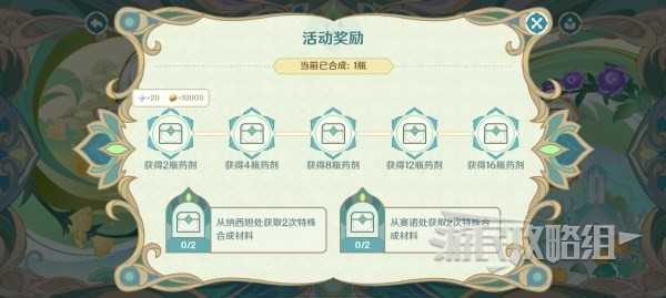 - 活动奖励:累计获得16瓶药剂、获得纳西妲与赛诺的全部特殊素材、解锁全图鉴后,共可获得原石×120、精锻用魔矿×4、大英雄的经验×8、摩拉×、祝圣油膏×5(游戏内奖励将通过游戏内邮件发放,邮件有效期为30天,请及时领取)