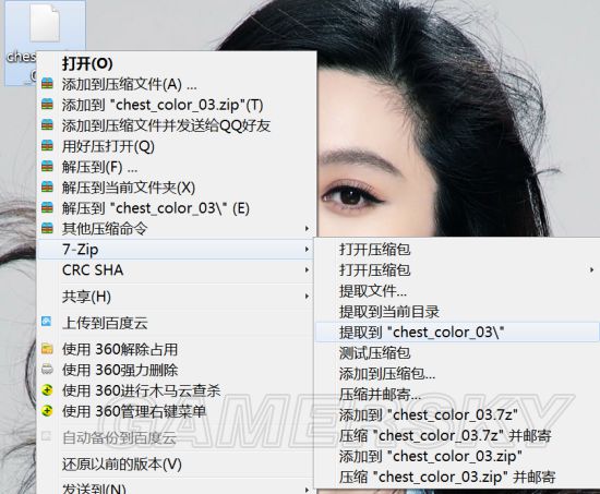 第五步:用7-ZIP打开你想修改的球员面补,将修改过的手臂贴图文件和chest_color_03的第二个文件一起放到球员面补里(放进詹姆斯的face1013.iff)