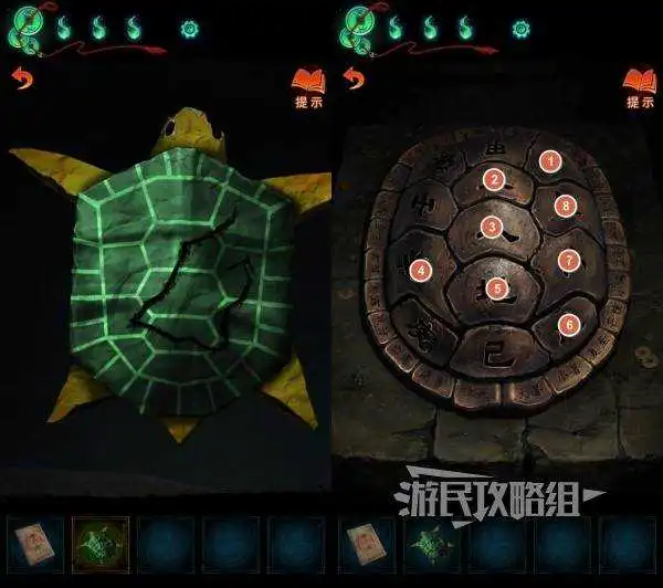 钓到绿色纸乌龟,查看龟壳上的纹路,获得龟甲顺序的线索。回到算命摊所在区域,从算命摊右侧大门上楼触发对话。对话完毕后左侧龟壳,按照纸乌龟上画的箭头顺序对应的龟壳。