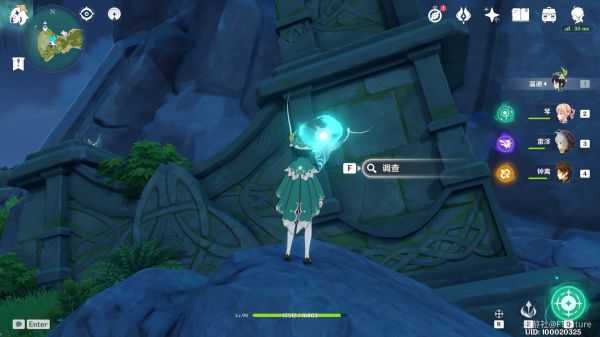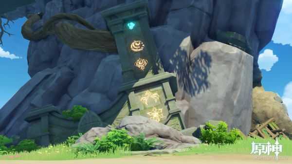 虽然放眼望去,周围确实有很多各式各样的机关,但这次调查我们并不用走远,调查点就在仙灵旁边这个刻着元素符号的石柱上,靠近即可调查。