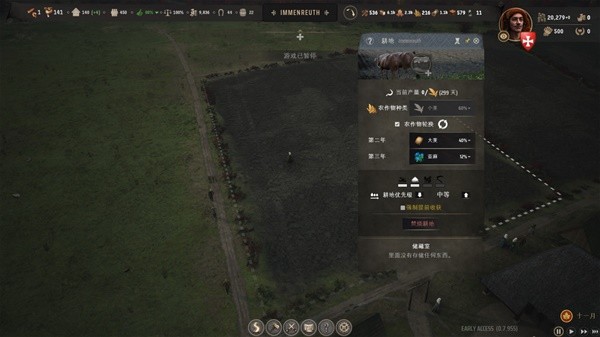 轮作可以恢复肥力的同时兼顾生产,10月初至次年9月末为一轮(这样导致一个bug,9月如果收快了,且农舍打谷优先级最低,农民会收完后立刻犁地种植本次的作物,但到了十月下一个周期会强制清空耕地,也就是说9月也是可以耕种的,只不过因为代码问题没办法提前几天种植)