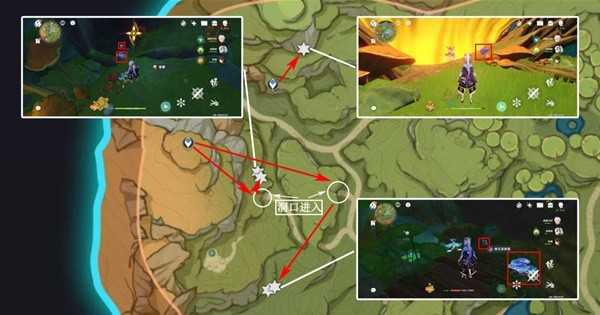 左上采集点,觉王之殿两侧均可过去;右上由洞口进入路线最便捷,前提是需要解锁洞口;右下位于空心断木的中心,利用四叶印可快速到达。