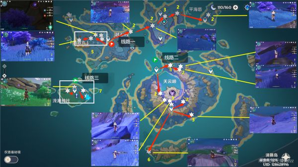 线路一中的天衡山洞穴存在大量晶蝶,是一处十分高效的采集点。层岩巨渊的晶蝶点位,每一个里传送点都比较近,要是大量需要,也是一条可行的线路。
