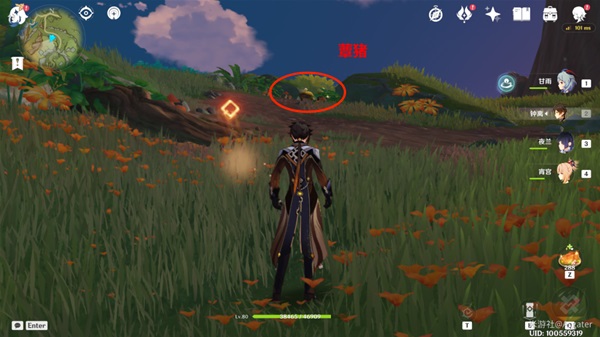 1.首先是任务接取点,先切出弓箭角色,切出弓箭角色,然后站在稍远的距离射击下图中的蕈猪,注意一定不要直接靠过去,不然蕈猪被吓跑就需要等明天才能在做。