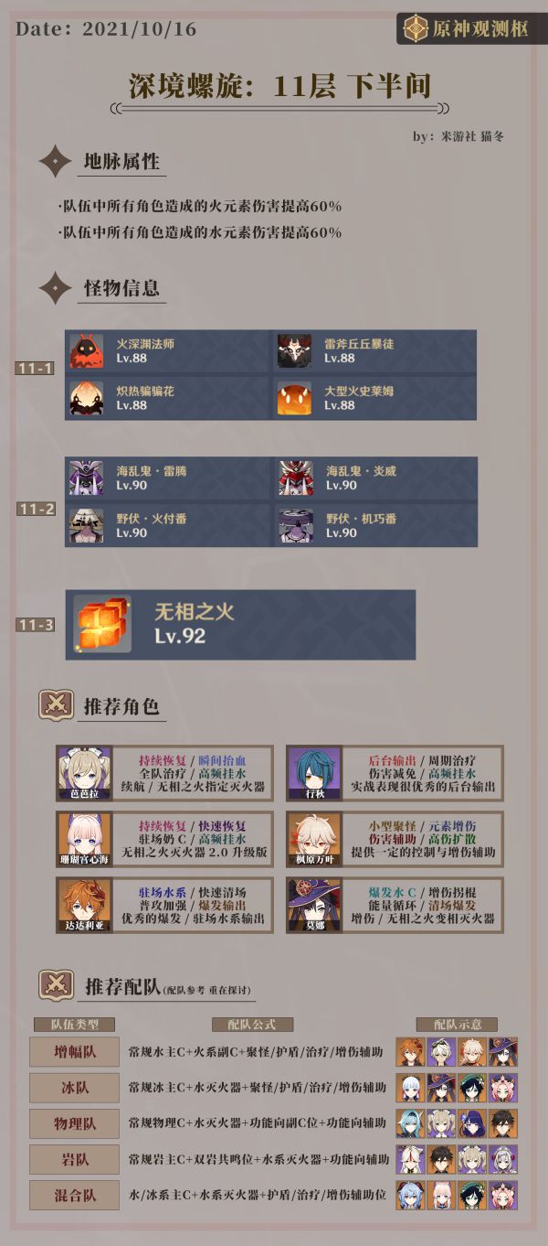 怪物特性:11-1、11-2与11-3的怪物都含有火盾相关的特性,常规的火C角色战斗体验不佳;建议选择非火核主C打法;如果选择的是非水核主C打法体系,请务必携带一名“灭火器”定位的角色。