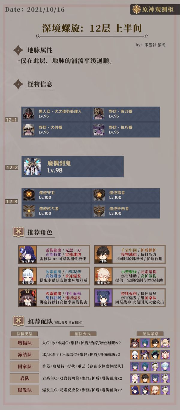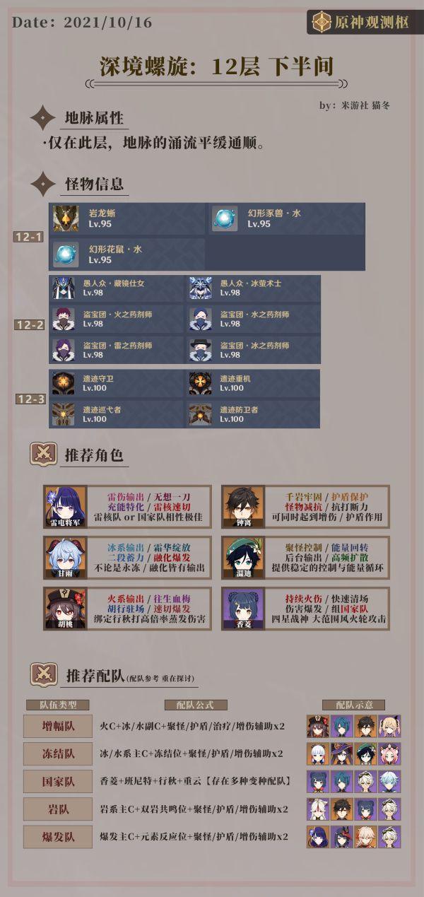 12-1部分:岩龙蜥的生命值较厚,纯水生物虽然免疫水系攻击,但是好在正常的火核/雷核/冰核等打法都能比较容易的应对;比如[胡桃蒸发队][雷核爆发队][冰核驻场打法]