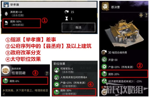 可以通过任命太守、指派差事、建造特定建筑和研究特定改革来打击腐败现象。