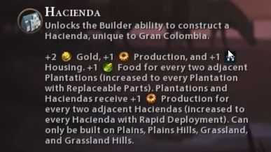 额外的住房,金币和生产力的加成,若临近种植园则由食物加成。种植园和大庄园可以从临近的大庄园中获得生产力加成。