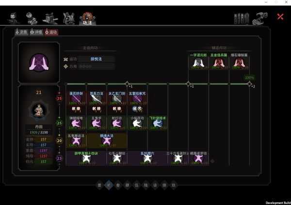 这里我们需要去百花谷学一个乱针错穴,然后顺手学一个飞针加攻击速度和移速,接着去然山把内功绝技和奇门学一学,五雷招来咒用来加造成内伤,五鬼搬运法加移速,摄魂大法加精妙,都挂上。最后再去学一学图上三个刀剑挂上加精妙。好了,现在再挑一个剑冢打,你会发现他贼菜