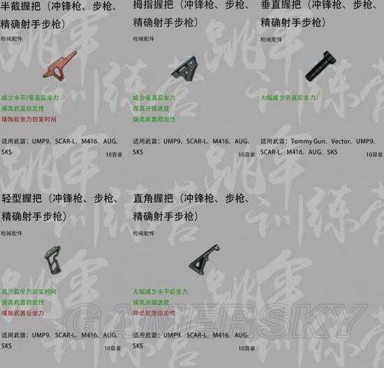 先前的两款(垂直和直角)握把作用较为突出,有针对性的提高;而新增的三款握把两款(半截和拇指)较为全面,更适合进阶玩家使用;最后的轻型握把效果极端,针对性更强,只适用于远距离点射。