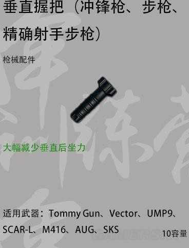 垂直握把:垂直握把在更新后的作用更加单一,只减少垂直方向后坐力,并且是大幅减少。在5.56步枪后坐力大幅增加的年代,垂直握把的作用就更加明显了,显而易见这个握把更加推荐压枪能力不是特别强的玩家使用。
