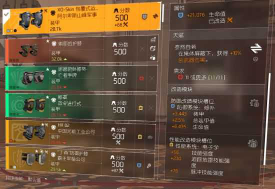 胸甲——511,原因很简单,可以堆两红槽啊……基板可以找两红一黄或者一红一蓝一黄,挑电值高同时带爆率的,然后洗武器伤。天赋可以用硬化或者生机(注意——需要搭配背包来看,譬如背包有生机那么胸甲就别也生机了),不推荐警戒是因为你有随便一个怪都可以隔着几百米打中你,然后你的警戒就CD了……。5-11一件足矣。