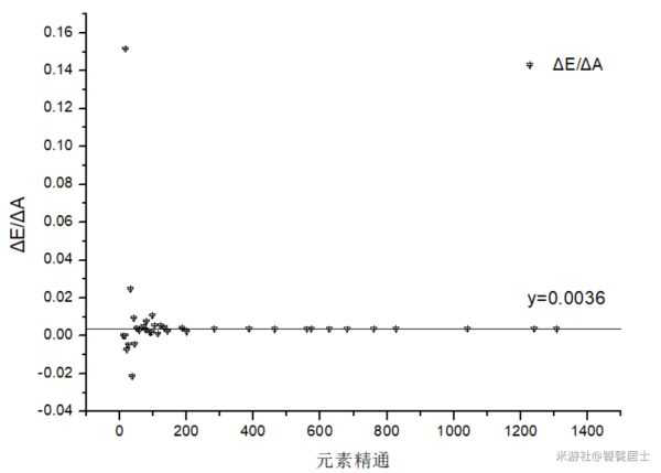 验算,令P/A=E,对看作连续的散点图求导数 (ΔE/ΔA),导数如下图所示: