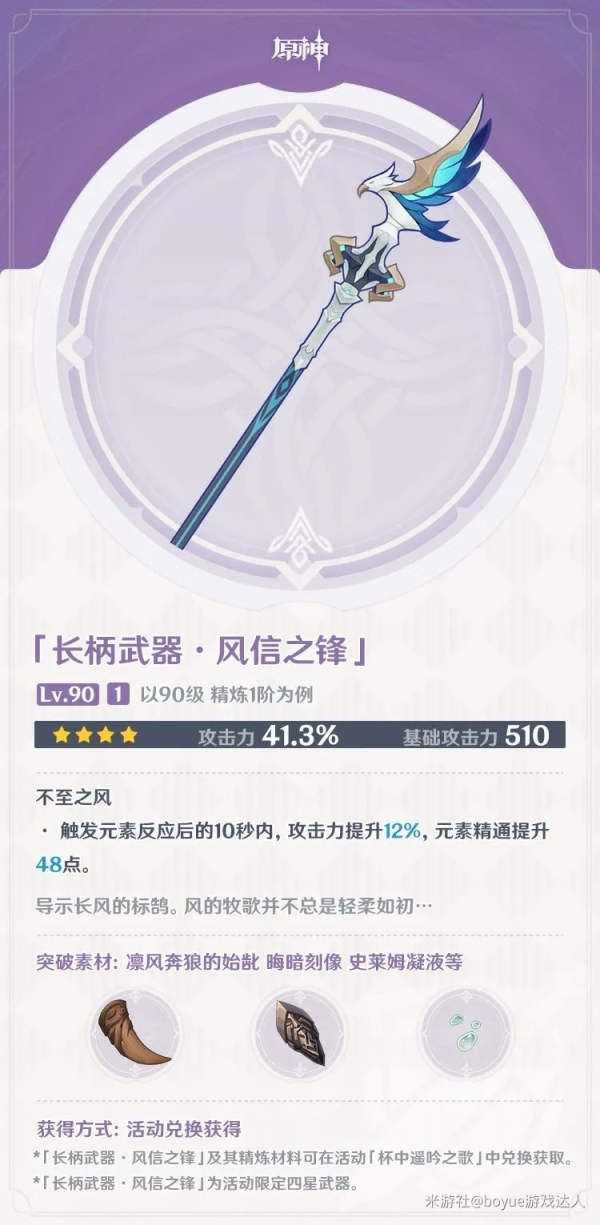 4星武器:风信之锋>决斗之枪>3星白缨枪,这次蒙德酒节的风信之锋也是挺适合赛诺来使用的,同时能够比较容易满精炼,没抽到专武的玩家可以选择这把。