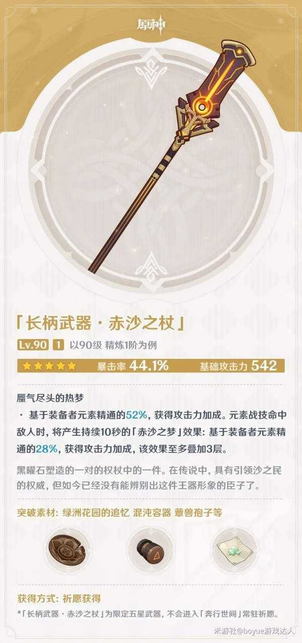 5星武器:赤沙之杖>和璞鸢>护摩之杖/贯虹之槊/息灾,专武自然是最为适配的,无论颜色还是属性,进一步加强了元素精通的实用性,其次是和璞鸢等武器。