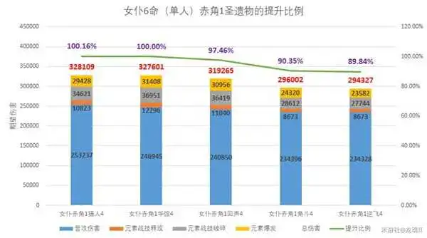 昔时套的伤害量和角色其他面板属性是有关的,这点和申鹤的冰翎是一样的,这里我们选取了300%爆伤+200%增伤的枫丹角色面板,这已经非常恐怖了。而昔时套与海染套相比,启动时间是和能提供的伤害总量都是比海染要多的。分别按海染3.5秒和昔时6秒分别进行秒伤换算,可以看到在对单的时候昔时套和海染套的伤害效果还算能比较接近,但是但凡多一只怪或者队伍中没有减抗角色,昔时套的伤害效果都明显不如海染套了。但这也不意味着昔时套就没有优势,昔时套的优势在于叠满所需的奶量比较少,6秒15000的奶量比起海染3秒30000的奶量不知道好叠了多少,所以他的伤害效果低一些也是可以接受的。