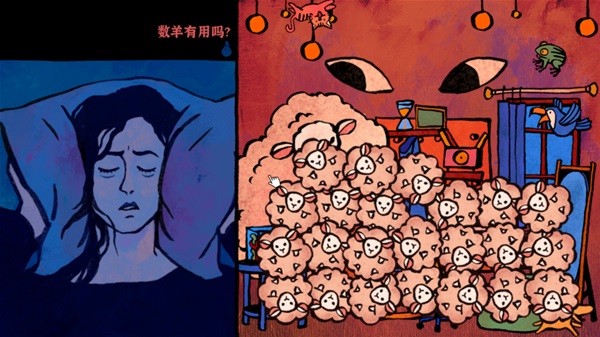 在又一个夜晚再次无法入睡的女主,看到了一个如同马戏团小丑一样的“小人”出现在脑海中,这位小人完全无法体验到主人失眠的痛苦,却只想在她的脑海中开启一场party。于是原本代表欢乐的音乐因为喧闹而显得刺耳,我们的主人公也尝试了各种方式与它对抗——比如关掉电灯、割断锁链等等,还有作为催眠“传统艺能”的数羊:每一次屏幕上的大羊,就会有一只小羊出现,但如同相关成就的名字:“数羊有用么?”,这样对抗性的方式并不能让我们成功入睡。