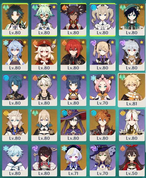 几乎所有脱手角色,包括行秋、皇女、点赞、香菱、凯亚、莫娜、甘雨、温蒂、北斗、重云、钟离、七七、猫猫、砂糖。(有漏掉的吗)