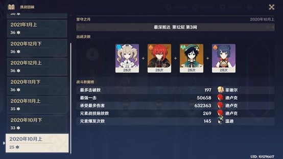 深渊从第一版第一期在43级通过12-3,在第三期52级时开始打满,包括几个朋友的号(氪度不超过1W),试验过各种配队,总共打了大概有600多次左右(由于足够的练度凹的情况比较少),深渊情况具体如下图。