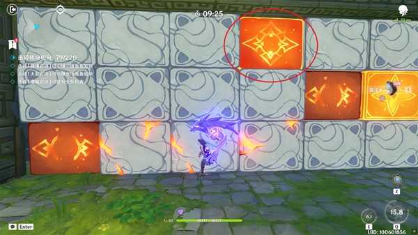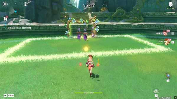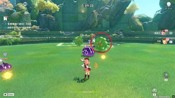 本关利用试用角色烟绯与可莉进行攻击触发超载反应,将史莱姆投入「藤蔓球门」获得积分,挑战中。队伍角色无法使用元素爆发