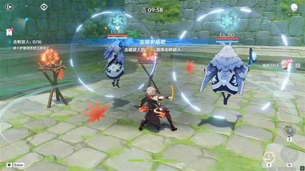 利用试用角色万叶的元素战技和元素爆发击破敌人的护盾,直接击败敌人。