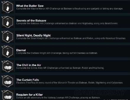 1.What The Butler Saw:在没有使用任何装备和受到任何伤害的情况下以蝙蝠侠完成Wayne Manor挑战关卡