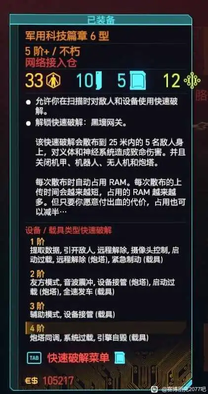 《赛博朋克2077往日之影》军用科技篇章6型可以直接在黑入后秒杀敌人,下面请看玩家“活宝非打死”带来的《赛博朋克2077往日之影》黑客流毕业义体推荐,希望能帮助到大家。