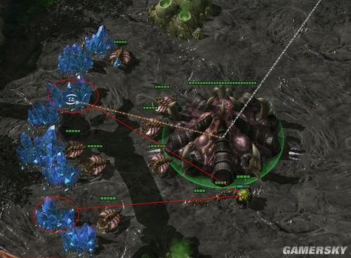 如图可以将刚要孵化出的工虫设集结点到这两个无其它工虫采矿的地点喔