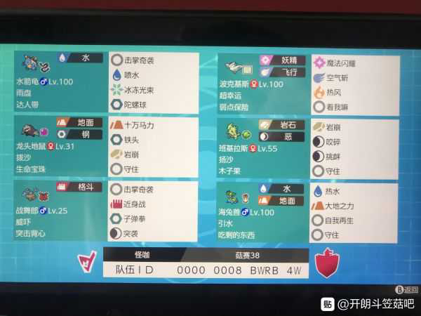 先聊聊组队思路吧。由于这次菇赛正值咆哮虎一众新解禁的环境变动期,所以我在组队时首先就将目光放在了这些大家在S4初期遇到时相对会感到陌生的宝可梦身上,因为预料到了咆哮虎西狮妙蛙花的热门,又正巧看到了阿g在S3末期自由对战里试破壳水箭龟的队伍,我就开始围绕水箭龟思考构筑。