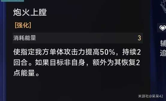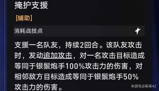 战技掩护支援可以配合各种霸主以太灵打出追加连击效果,例如上述的【银鬓尉官】,每一次的盾反,都会让炮手追加攻击,最多三个单位的输出大大提高了整个队伍的反击能力,堆攻击力就可以。