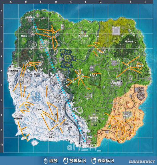 三门给大家做了一张滑索的简略分布图,我们可以看到滑索的分布主要集中在雪地、沙漠、森林和山地中。这张图建议各位堡堡们可以保存一下,以备不时之需!
