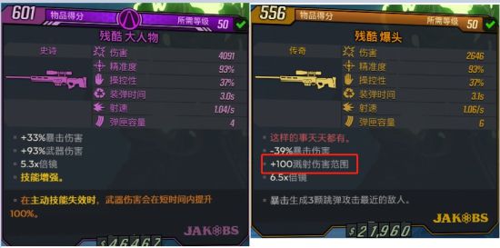 首先让我们来看一看上面的对比图,毫无疑问残酷大人物完胜,但是各位注意到爆头这把狙击枪中的红框了么?对伤害计算方式有一定了解的同学一定就会明白我在表达什么意思了——爆头这把狙击枪吃“范围伤”和“溅射伤害”的额外加成!!!!