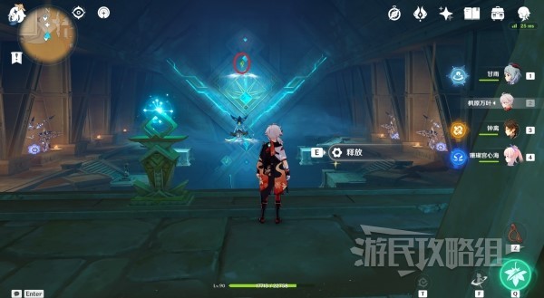 这里下方需要先排水。往左前方(小地图西北边)飞,落到有元素方碑的那一层。