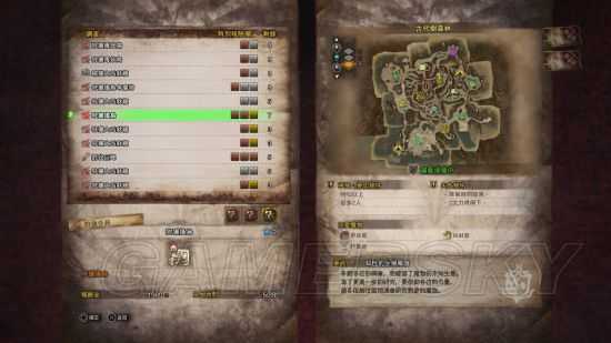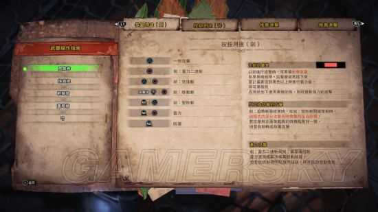 怪物图鉴非常给力,不仅有直观的肉质和可破坏部位显示,还能看到所有能够掉落的素材,当然想要解锁还是需要摸怪物脚印、收集怪物的各种分泌物。另外如果从菜单打开「猎人笔记」,旁边还会有武器操作指南,对还不熟悉武器的新人来说是一大福音。