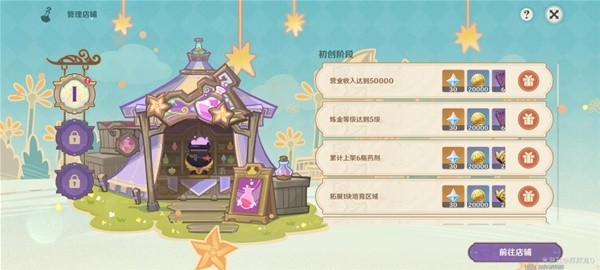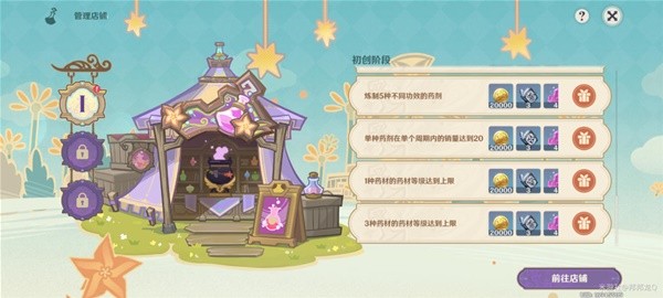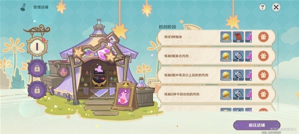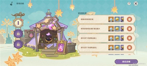 把三个药剂放入货架并且升级,拿炼金等级提升给的钱购买培育区域扩展其三,种上刚解锁的药材。结束这一周期