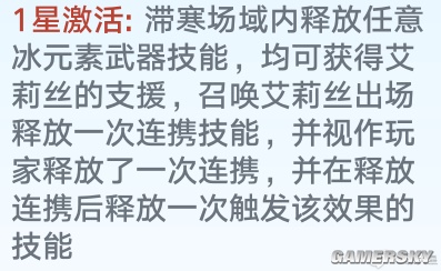 其次是艾莉丝的1星效果,每次释放技能获得艾莉丝援助,一次艾莉丝连携+1次复制技能。