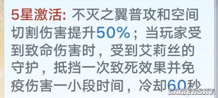艾莉丝5星效果:增加了普攻和空间切割的伤害,以及60秒一次的免死效果。