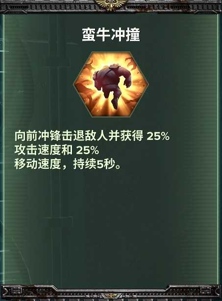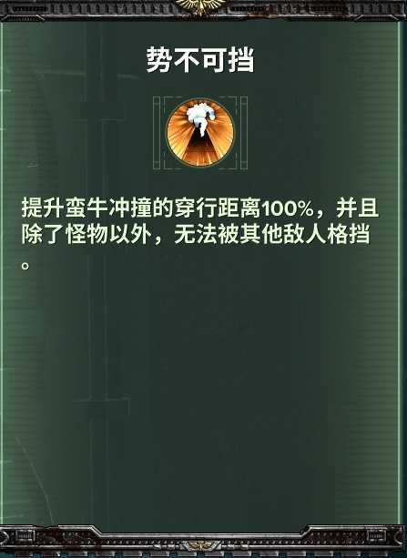 最后一个技能选择势不可挡,增加的冲锋距离和无法被除了BOSS以外的单位阻挡特性,在面对怪潮和重甲欧格林集群时可以极其有效的进行大范围的控制,让队友快速清理和自己救场