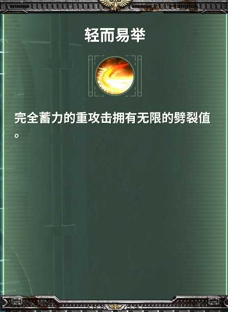 下一个技能选择轻而易举,欧格林很多时候都需要完全蓄力的重攻击来进行打击控场,无限的劈裂值可以无视重装敌人的装甲值判定,可以更有效的攻击重甲单位
