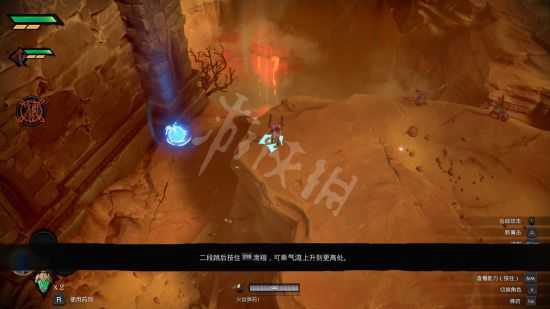 遇到空中飘浮着的蓝色光圈时按鼠标左键可以使用幽灵勾爪飞跃上去。在石壁上攀爬时,按C可以向下跳,按空格可以向上跳。