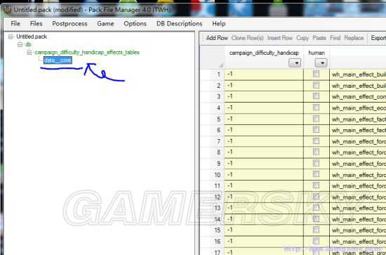 使用PFM4.0版打开游戏目录下DATA目录下的data.pack在DB\campaign_difficulty_handicap_effects_tables\data_core