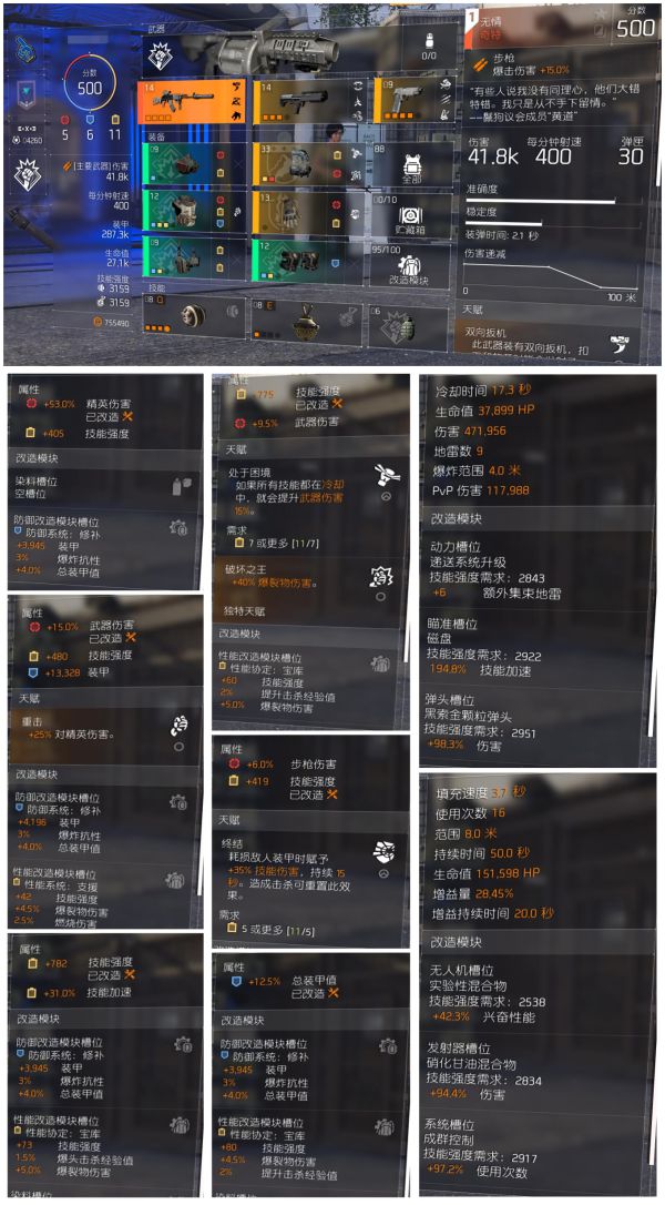 这套也是我PVE用到最多的一套配装,简单效率,有溜溜球的群体伤害,也有无情高达700w的单体伤害,有带治疗量的奶枪,也有速刷图可以用的强心加速蜂巢,有基本常驻40w的护甲,还有给团队增加40%爆裂伤的buff。