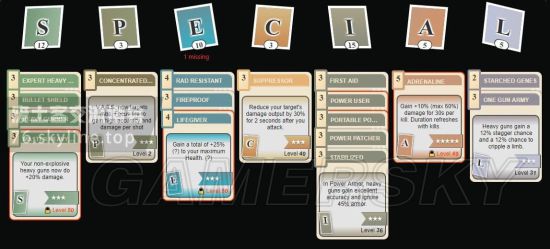 建议练级时优先选择精准射击Concentrated Fire,撬锁Picklock,黑客Hacker,医护First Aid和枪匠。Gunsmith。